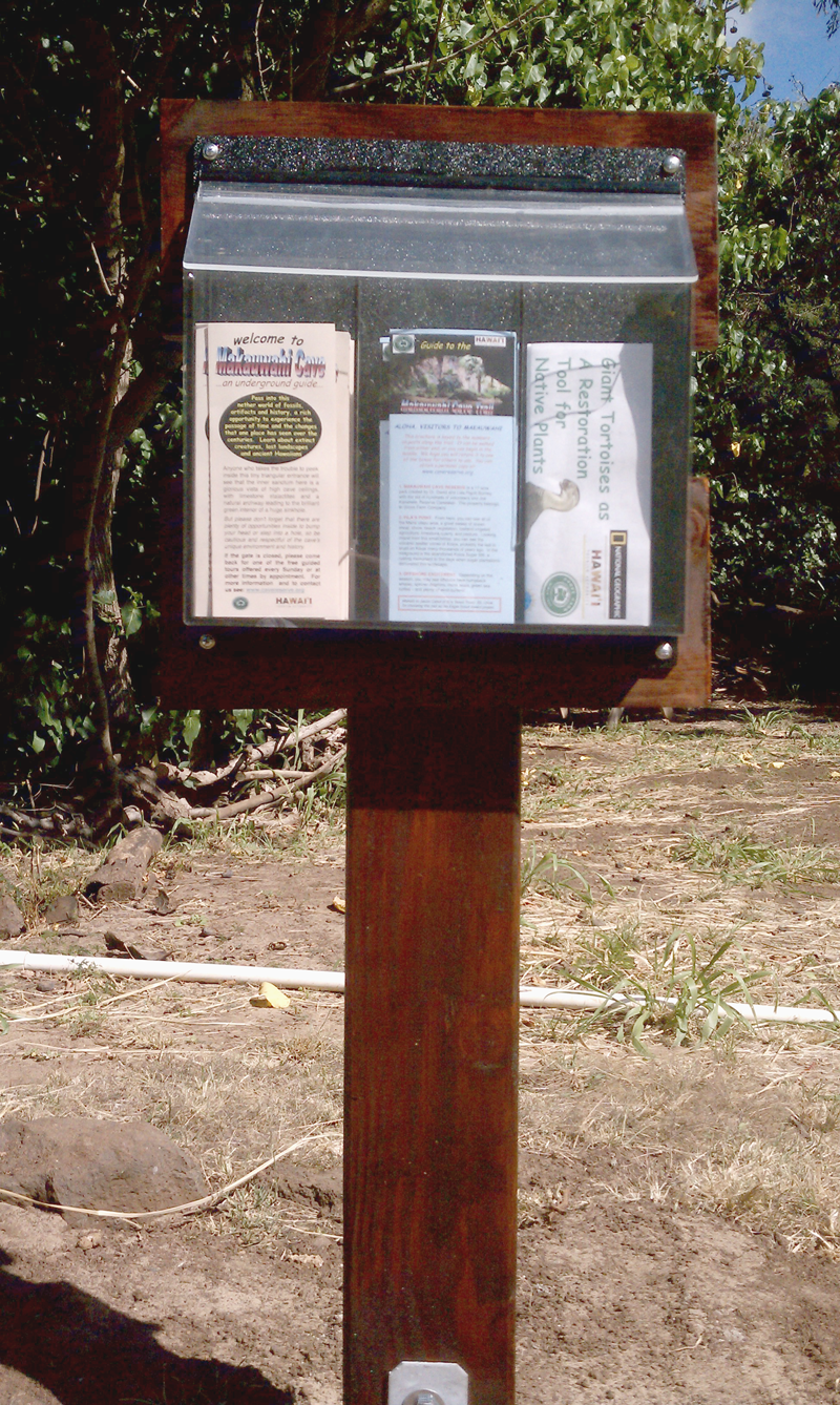 The Makauwahi Cave Trail, our beautiful nature trail winding through the 17 acres, has been self-guiding for a couple of years, with not-so-great metal mailboxes for dispensers.  Now also the cave itself is fully self-guiding, with its own brochure, and we have deployed a new generation of dispenser boxes.  Our lovely new Plexiglas brochure boxes arrived recently, and they are now up, mounted on (what we hope are) termite-proof posts.  The posts are galvanized metal set in concrete below ground, and beautiful dark-stained wood above.